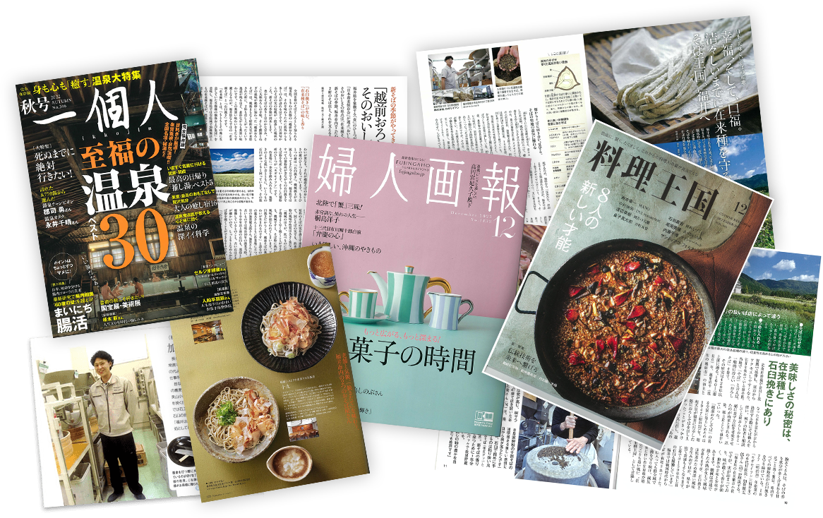 蕎麦に向き合い、福井県産の無農薬原料を使用し、創業以来伝わる石臼を守り日々変わらぬ技術と製法でそば粉を挽いています。